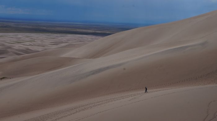 Mit unserem Jahrespass kamen wir wieder kostenlos rein und wir überlegten uns was denn das geeignete Schuhwerk ist. Egal was man anzieht, die Schuhe sind früher oder später voll Sand und barfuss ist keine Alternative, denn der Sand ist sehr heiss. Wir marschierten optimistisch drauf los mit dem Ziel zuerst den kleineren Gipfel (213 m) zu besteigen. Aber der weiche, tiefe Sand und die Höhe von 2500 m über Meeresspiegel lassen das Marschtempo schnell nachlassen und man ist froh überhaupt sichtbar vorwärts zu kommen ohne ständig stehen bleiben zu müssen. In dieser Sandwüste hat man gar keine Orientierungspunkte zum Feststellen wie schnell man vorwärts kommt. Je weiter wir in die Sandberge rein kamen desto stärker wurde der Wind und man hatte plötzlich einen weiteren Gegner! Irgendwann hatten wir es aber geschafft und konnten die Aussicht von da oben geniessen. Zum Glück war es etwas wolkig, nur für die Fotos hätte es sonniger sein können.