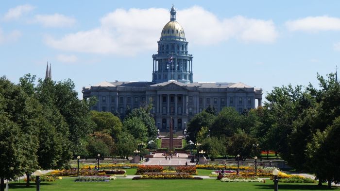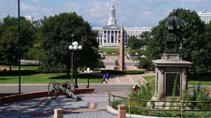 Wir sind nicht rein gegangen, weil uns die Sicherheitseinrichtungen am Eingang abgeschreckt haben. Aber den grossen Treppenaufgang haben wir uns angesehen und die Mile High-Markierung natürlich auch (auf’s Foto haben wir aber verzichtet). Dafür hat man von hier oben einen grossartigen Blick auf den Civic Center Park und die US-Mint.