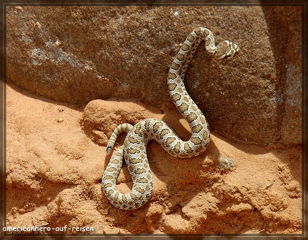 Kurz darauf hatten wir dann unsere erste Schlangenbegegnung, was mich ja ganz besonders freute, da ich Schlangen einfach total gerne mochte. :groove: An einen der Felsen gekuschelt und die warme Sonne geniessend sah ein kleiner Rattler. Erst im Nachhinein konnten wir herausfinden, das es eine Midget Rattlesnake war.