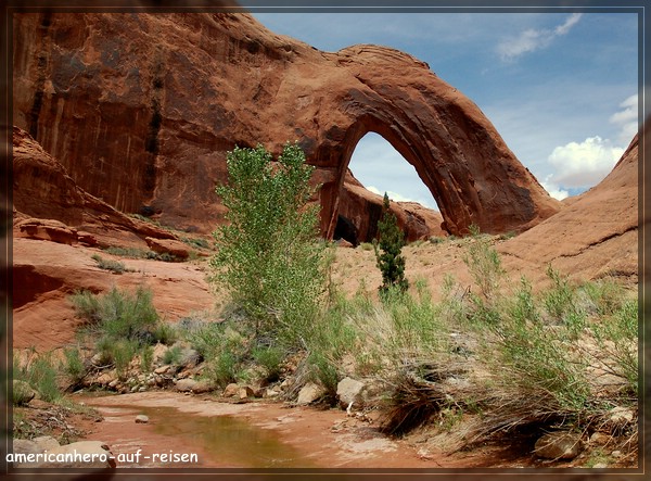 Nach einer Kurve sahen wir ihn dann auch vor uns, den Broken Bow Arch. Wirklich ein imposanter Arch. Und zur Feier des Tages verschwand dann die Sonne erst einmal hinter einigen dicken Wolken, die sich klammheimlich angeschlichen hatten. Na super, das kam uns ja so bekannt vor. Allzu lange sollte es aber nicht dauern, bis der Arch wieder im rechten Licht stehen wuerde und ich nutzte die Zeit, um noch ein wenig weiter im Creek zu laufen.