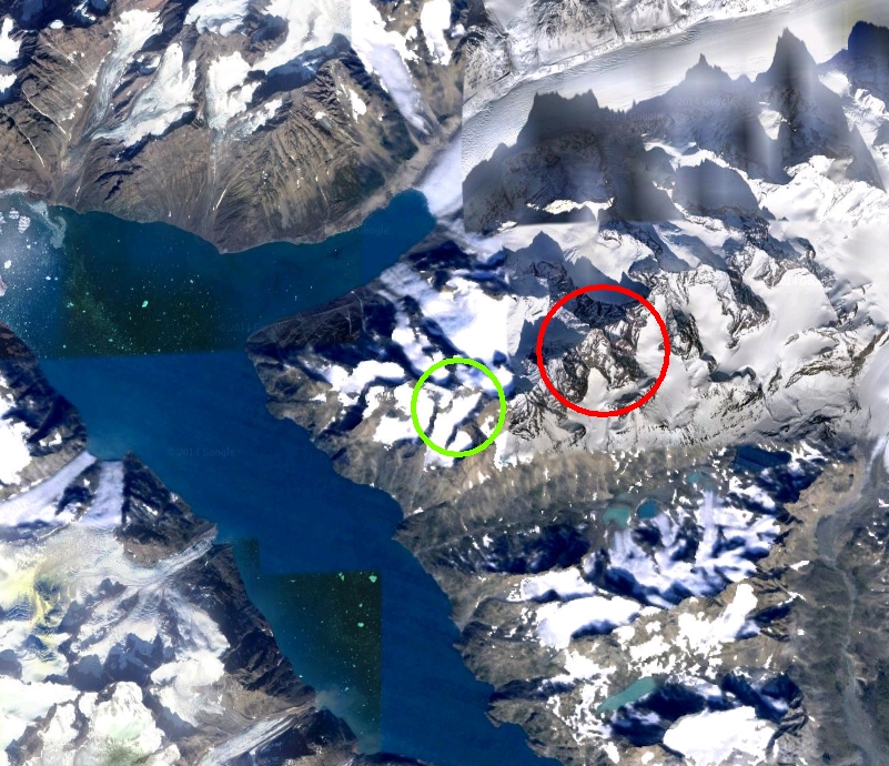Es ist an der gefundenen Stelle. Das linke Schneefeld liegt nur etwas weiter "hinten" als ich zunächst dachte. Es hat die Position 66.606986, -36.840180 und ist im Satellitenbild hier zu sehen.