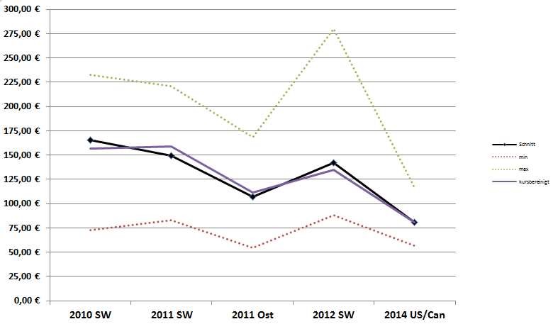 Hier mal eine Grafik zu den Hotelpreisen pro Paar/Nacht die wir auf unseren bisherigen Reisen gebucht haben.