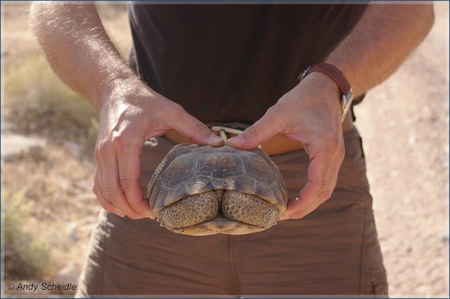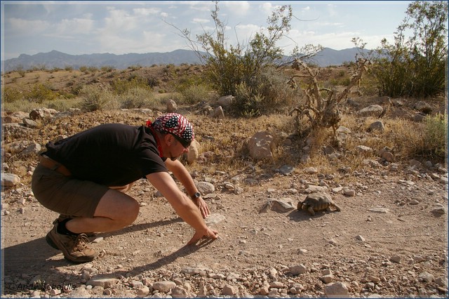 In Nevada machen wir wieder eine Stunde Zeit gut, also sind wir sehr früh dran. Als wir die Interstate verlassen zieht sich die Strecke schon lange hin, bis wir endlich von der breiten Gravelroad abbiegen und uns Richtung Wash bewegen. Irgendwann sieht Elke, dass in noch weiterer Entfernung etwas auf der Fahrspur liegt, sich aber wohl bewegt und drängt Andy zum anhalten. Sie und Robby stürmen aus dem Auto und laufen auf das „Objekt“ zu – es handelt sich um eine Desert Tortoise, die langsam und gemächlich den Weg überquert. Das Tier ist ziemlich groß und weil wir nichts riskieren wollen, nimmt Robby es kurzerhand am Panzer – er hat mit einer Hausschildkröte ja bereits Erfahrung – und setzt die Turtle in sicherem Abstand zur Fahrbahn wieder ab. Das Tier ist so verängstigt, dass es erst mal auf Tauchstation geht. Ob er oder sie jemals schon eine Begegnung mit der anderen Art hatte?