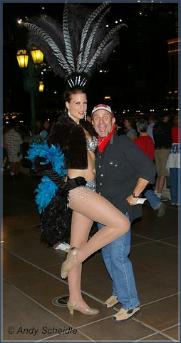 Wir ziehen weiter und auf einmal steht eine große schlanke Blondine mit Federschmuck und kurzem Corsagenanzug auf dem Gehweg, die sich gegen ein Trinkgeld mit Interessierten ablichten lässt. Robby nimmt die Chance wahr und lässt von Andy ein Foto für seinen Freund Peter machen. Die große Blonde soll einen von Robby vorbereiteten Zettel sichtbar in die Kamera halten, was sie auch prompt macht. Anschließend darf Robby noch mit aufs Bild und er ist im Vergleich zu der Lady ziemlich klein. Für einen Dollar bedankt sich die Posierdame und wir marschieren weiter.