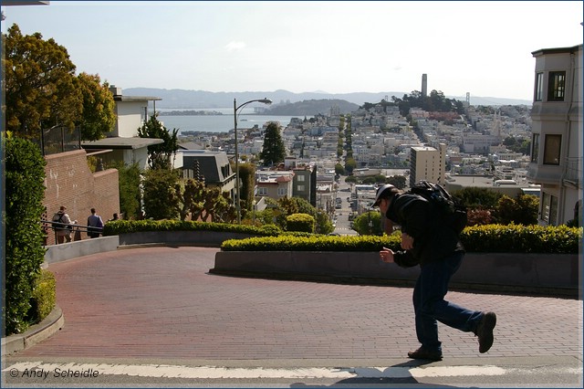 Wir laufen zum bekannten Abschnitt der Lombard Street mit den vielen Kurven, das Wetter ist heute übrigens wieder prima, aber der Wind weht genauso kalt wie gestern. Elke und Robby nehmen sich die Treppen nach oben vor; Robby will im Laufschritt die Lombard Street runter laufen – also dann los. Die zwei kommen ganz schön außer Puste, sind aber nach wenigen Minuten wieder zurück und der sportliche „Einlauf“ wird von Andy festgehalten.