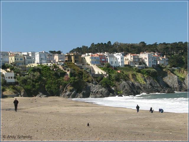 Nach dem Frühstück checkt Andy noch Mails und holt noch ein paar Infos aus dem Netz. Wir wollen den Tag ruhig beginnen, es ist ja schließlich Sonntag und so fahren wir gemütlich durch Downtown und dann den Embarcadero entlang. Bei Chrissy Field steigen wir aus und genießen den ersten Blick auf die Golden Gate Bridge. Wir laufen bis zum Fort Point und sehen einigen Surfern zu, die sich in den kalten Fluten direkt unterhalb der Brücke tummeln. Weiter geht es durchs Presidio und wir halten wieder am Aussichtspunkt bei der Brückenauffahrt.