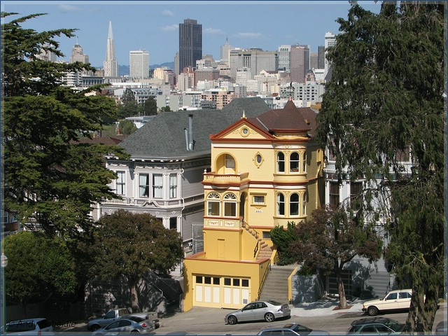 Über Ashbury Haights, wo wir zwar aussteigen wollen, aber keinen Parkplatz finden, fahren wir zum Alamo Square, dort umrunden wir den Platz auch einmal und finden ebenso wenig einen Parkplatz. Da es Elke aufgrund der Fahrerei und in die Karte schauen nicht so gut geht, halten wir vor einer Garagenzufahrt und Robby bleibt im Wagen sitzen, während wir uns der Painted Ladies widmen.