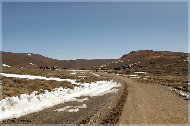 Carson City - TonopahUm kurz nach 6.00 Uhr klingelt Andys Wecker und er wirft uns erbarmungslos aus den Federn. Wir packen zusammen, verstauen auch gleich das Gepäck im Auto, Andy und Elke gehen zum Frühstück und lösen den Gutschein ein. Mit je einem großen Teller Porridge und heißem Getränk versorgt gesellt sich noch Robby dazu und dann geht es um 7.30 h los mit Zielrichtung Bodie. Die Sonne scheint, der Wind hat nachgelassen, es hat um die 0 °C. Gemütlich, da um diese Zeit ziemlich viel Verkehr ist, fahren wir auf der US-395 Richtung Südosten, zu unserer Rechten begleiten uns die schneebedeckten Gipfel der Sierra Nevada. Kurz bevor wir nach Bodie abbiegen, halten wir noch an einer Rangerstation und erkundigen uns nach den Straßenverhältnissen. Die beiden netten Herren berichten, was Ihnen ein dort zuständiger Ranger erzählt hat, nämlich das der Weg schneefrei sei, allerdings sind sie sich nicht sicher, ob man bis nach Bodie selbst fahren kann, oder ob die letzten zwei Meilen zu Fuß zurückzulegen sind. Das hört sich auf jeden Fall schon mal gut an. Wir nehmen noch ein paar Postkarten mit und als Elke zahlt, bekommt sie noch einen ausführlichen Prospekt mit, der nicht nur Bodie, sondern auch einige Ziele in der näheren Umgebung gut beschreibt.