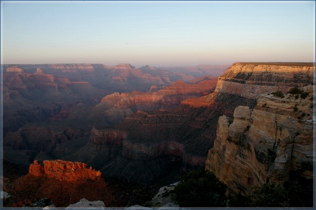 Wir genießen trotz der Menschenmengen die Ausblicke und fahren dann zur Yavapai Lodge, wo wir die nächsten zwei Nächte verbringen. Wir laden unsere Sachen aus, richten schon mal die Rucksäcke für unsere morgige Tour und machen uns dann zum Sonnenaufgang nochmal auf zum Parkplatz der Bright Angel Lodge. Von dort aus laufen wir zum Maricopa Point, um von dort zu fotografieren. Es ist noch jede Menge los, wir sind nicht die Einzigen hier. Nach 20.00 h nehmen wir den Bus zurück zum Parkplatz und haben Glück, dass wir nicht am Hopi Point waren – die Menschenmassen, die per Bus zurück wollen, können auch in 3 Fuhren nicht abtransportiert werden.