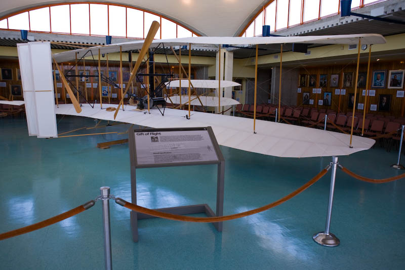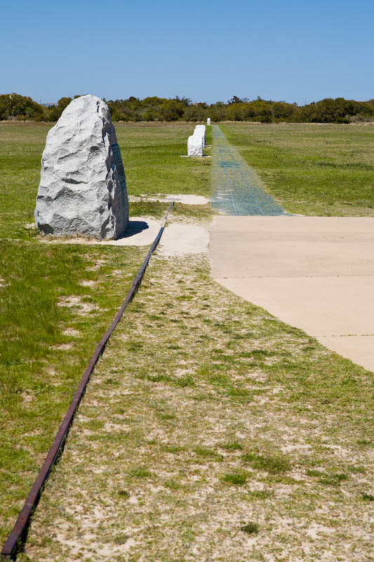 Neben einer Halle mit dem Fluggerät als Nachbau, einem Gleiter, mit dem sie frühere Versuche gemacht haben, einer Galerie von Flugpionieren und einer ganz interessanten Ausstellung über die beiden Brüder und ihre Arbeit (erstaunlich, was sie alles an Motortechnik, Flügelkonstruktion, Tuchmaterial, etc. selber entwickelt haben) gibt es dort die Rampe von der sie gestartet sind zu besichtigen. Die Felsen markieren die Entfernung, die sie bei ihren ersten Flügen zurück gelegt haben.