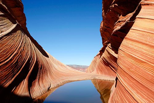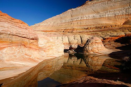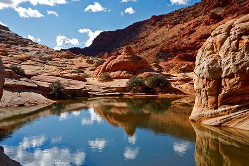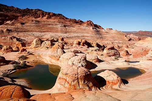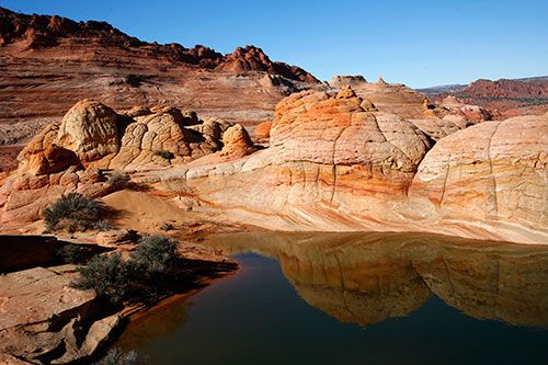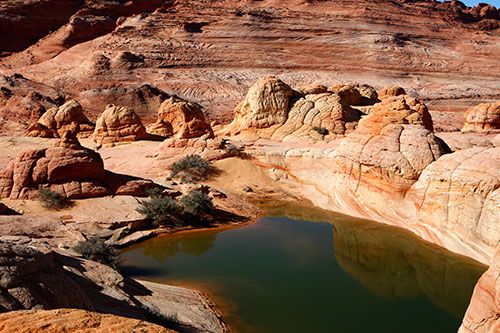 Schon beim fotografieren an der Wave hatte ich ein amerikanisches Fotografen (Ehe-?) Paar kennengelernt, mit denen ich dann das Plateau oberhalb der Wave erforscht habe. Auch dort oben gab es einige Pools mit Regenwasser, in denen sich die Brainrocks gespiegelt haben. Wohin man auch sah, überall tolle Motive.