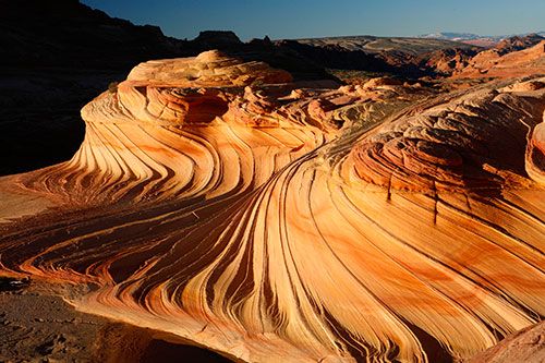 Im Licht der untergehenden Sonne werden die Farben und Strukturen von Minute zu Minute immer eindrucksvoller. Nach Ausssagen des Amis, der woh schon mehr als 10x hier war, ist der November auch die ideale Zeit, weil die Sonne dann über einem Einschnitt in den Bergen untergeht und die Second Wave damit bis kurz vor Sonnenuntergang in der Sonne liegt.