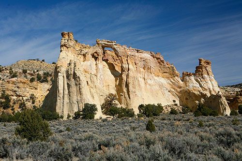Was jetzt? Weiterfahren bis zum Broken Bow Arch, nur um dann festzustellen, dass man da auch nicht hinkommt? Die einzige Straße, von der ich wusste, dass sie zu befahren ist, war die zu den Slot Canyons, und da war ich schonmal. Schließlich habe ich mich entschlossen zurück Richtung Highway 12 zu fahren. 3 Meilen bevor ich zurück auf dem Asphalt gewesen wäre bin ich auf die Cedar Wash Road abgebogen. Auch hier war hohe Bodenfreiheit erforderlich aber es gab keine größeren Hindernisse. Der Cedar Wash Arch liegt in einem hübschen Canyon aus weißem Sandstein und ist leicht zu erreichen (der Aussichtspunkt von dem man ihn am besten sieht).