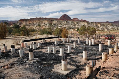 Leider hat sich der Himmel immer mehr zugezogen, so dass ich den Yellow Rock auf später verschieben musste. Ab und zu kam die Sonne aber immer noch durch, so dass sich ein kurzer Besuch beim Pariah Movie Set doch noch gelohnt hat. Vom eigentlichen Movie Set ist ja leider nichts mehr übrig außer ein paar Fundamenten. Welche Idioten wohl auf die Idee gekommen sind, da Feuer zu legen?