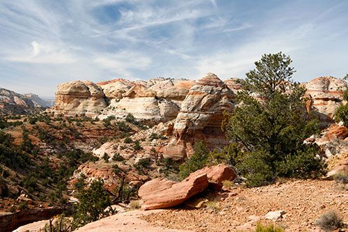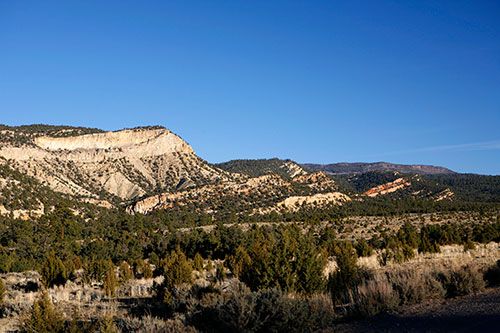 Erster Programmpunkt heute – die Hells Backbone Road. Gleich am Ortsausgang von Escalante links ab. Erst asphaltiert durch ein Wohngebiet und vorbei an einer Ranch, dann als gut ausgebaute Gravelroad langsam in die Höhe. Im ersten Teil hatte man eine schöne Aussicht auf diverse Sandsteinformationen.