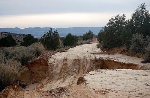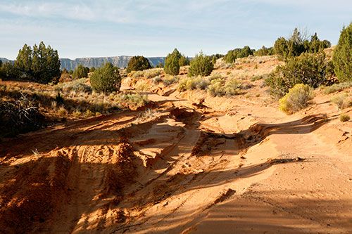 Nach gut drei Stunden war ich wieder im Auto. Bis zum Sonnenuntergang, den ich im Devils Garden an der Hole-in-the Rock Road verbringen wollte, war noch genug Zeit für ein wenig Geologie zum anfassen. Also auf zum Moki Hill. Auf der Fahrt dorthin war tatsächlich ein Auto mit High Clearance erforderlich. Neben mehreren kleineren Auswaschungen war die Straße an einer Stell komplett weggespült und die Umfahrung durch tiefen Sand war auch nicht viel besser. Aber die Reisschüssel hat es geschafft.