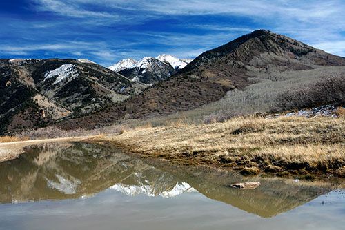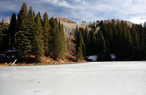 Am späten Vormittag bin ich aufgebrochen, um mir den La Sal Mountain Loop anzusehen. Lohnt sich! Eine sehr schöne Bergstrecke mit vielen Aussichtspunkten. Relativ am Anfang kam ein Wegweiser zum Lake Oowah. Ein netter kleiner Bergsee, warum nicht? Also die 3 oder 4 Meilen teilweise noch vereiste Gravel Road gefahren (zu großen Teilen war es eher eine Mud Road). Zu meiner Überraschung war der kleine See komplett zugefroren trotz Temperaturen von etwa 18° an desem Tag. Sah ganz interessant aus.