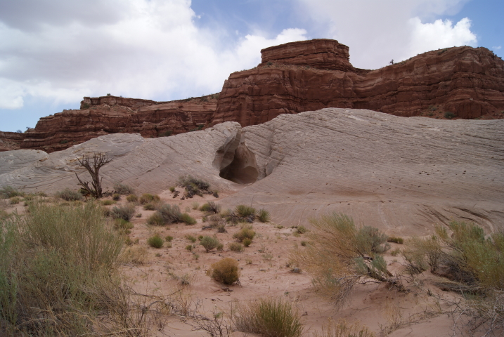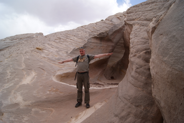 Die 89 führt uns dann zur ersten "Welle". Von der White Wave aka Nautilus habe ich irgendwo gelesen und sie in unseren Plan aufgenommen. Vor allem, weil der Weg dorthin als leicht beschrieben wurde. Ist er auch und man findet diese "weiße Welle" recht einfach. Blöderweise ist es so stürmisch, daß ich regelrecht gesandstrahlt werde. Ein ums andere Mal werde ich fast umgeweht. Ob des miesen Wetters halten wir uns nicht lange auf. Erst zuhause entdecke ich, daß sich hier wohl wieder Dreck auf den Sensor meiner Spiegelreflex gesetzt hat :-(