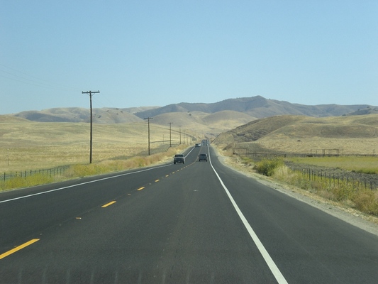 Der Tag war zwar eigentlich als Fahrtag geplant, aber je eher wir loskommen, desto größer die Wahrscheinlichkeit das wir uns schon was im Yosemite angucken können. Es war immer noch sehr nebelig als wir losfuhren, aber als wir dann von der Küste weg und über die Berge waren, kam auch die Sonne durch. Das erste Stück der Strecke war noch relativ interessant. Es ging eine ganze Weile durch Weinanbaugebiete. Aber danach ging es nur noch geradeaus und meilenweit war wirklich nichts.