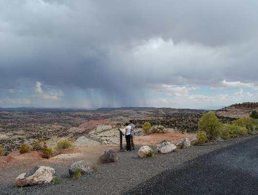 Wir überlegen ob wir in Boulder übernachten oder bis Torrey weiterfahren. Ich mache an einem Minimarkt, Boulder ist auch nur ein absolutes Mininest, halt und kaufe ein paar Postkarten und erkundige mich nach Unterkunftsmöglichkeiten. Die junge Dame zählt einiges auf, meint aber in Torrey ist mehrt Auswahl. Inzwischen hat uns mal wieder eine Gewitterwolke erwischt und es bläst und stürmt. Das macht uns Boulder auch nicht gerade sympathischer, also wird weiter gefahren.