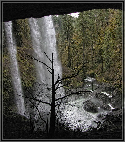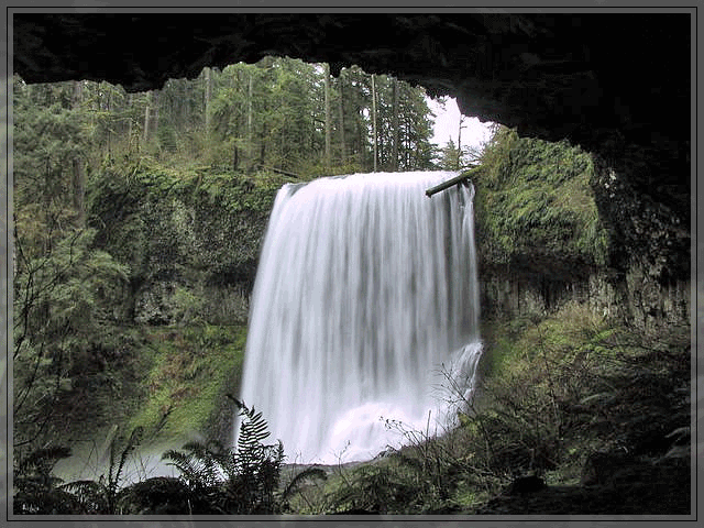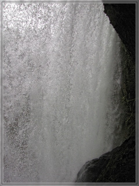 Weiter am Weg liegen die Middle North Falls, mein Favorit. Hier faellt der Silver Creek ueber eine breite Kante im Lavastrom, so dass sich eine donnernde Wasserwand bildet, hinter der man - relativ trocken - entlang gehen kann.