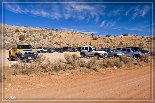 Wir machten unsere Bilder und ließen den Ort auf uns wirken. Um 13.00 Uhr waren wir zurück am Wirepass Trialhead. Ich warf mein GPS an und gemeinsam fuhr jeder in seinem Auto Richtung Abzweig White Pocket / CBS. Gerade als ich in diese Dirtroad einbog hupte Dirk von hinten. Seine Warnlampe wegen zu geringem Reifendruck ging zum wiederholtem Male an.