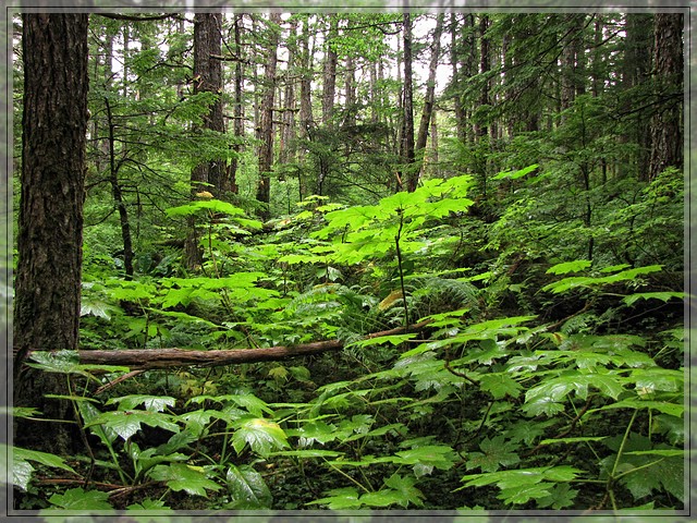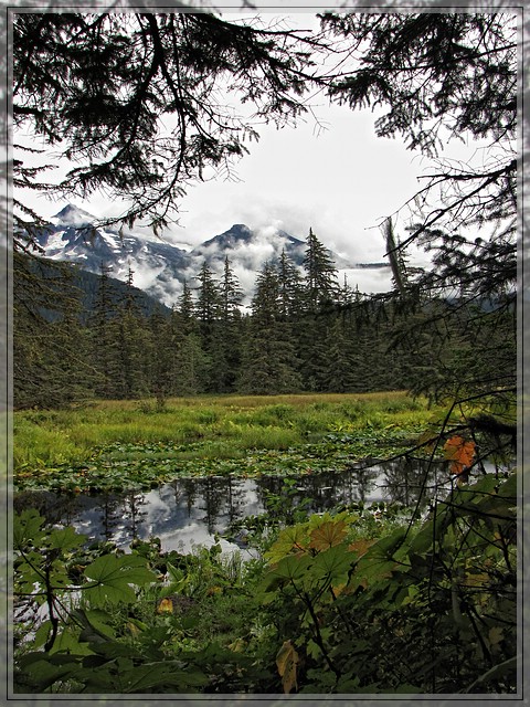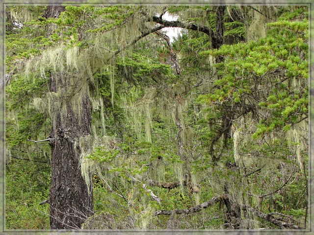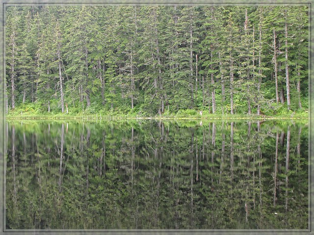 Der Weg zu dem See fuehrt durch ziemlich dichten Wald. Die Vegetation erinnert sehr an den Regenwald im Nordwesten, was eigentlich nicht weiter ueberrascht, da das Klima doch recht aehnlich ist. Habe vor ein paar Tagen eine frustierte Nachricht von Brad gelesen, dass mit Ski fahren nix ist, da es viel mehr regnet als schneit. Soviel zum Thema eiskaltes Alaska.