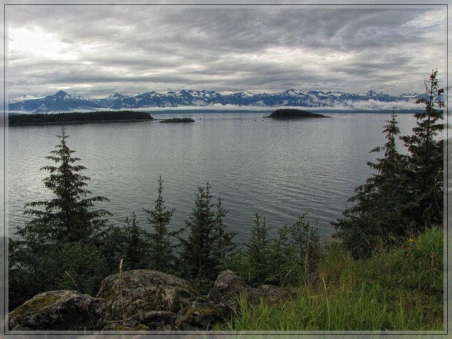 Eine tolle Aussicht! Ich schlage vor den Theresienschrein, der auf einer kleinen Halbinsel im Lynn Canal liegt, zu besuchen, aber die anderen drei haben Schmacht und wollen lieber dem heiligen Nikolaus, dem Schutzheiligen der Fischer bei Fish und Chips gedenken als der heiligen Theresa, die uebrigens  fuer Gaertner zustaendig ist.