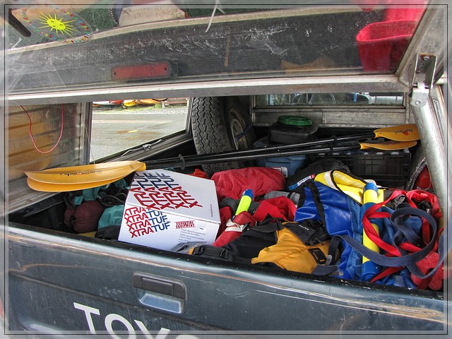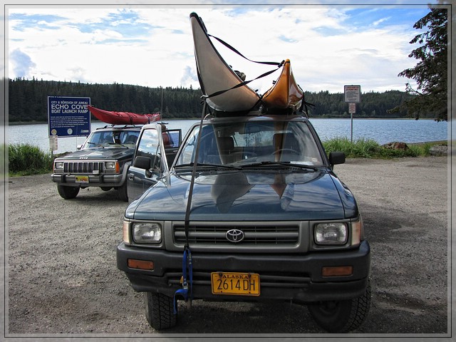 Da Brad lange Zeit als Tourguide fuer Rafting- und Kajaktouren gearbeitet hat und einen Kajakverleih in Juneau mitgegruendet hat, steht natuerlich eine breite Auswahl an Booten zu unserer Verfuegung. Da er aber schon ein paarmal bei anderer Gelegenheit mein Boot geliehen hat, besteht Brad darauf, dass ich sein eigenes Kajak nehme, worauf ich mich natuerlich entsprechend geehrt fuehle. Im persoenlichen Alaska-Tourguide-Boot unterwegs, wenn das man nix ist. Die Boote kommen aufs Dach und die Ladeflaeche von Brads Truck wurde mit allem moeglichen Krams vollgepackt, den man fuer so eine Tour unbedingt oder vielleicht oder gar nicht braucht.