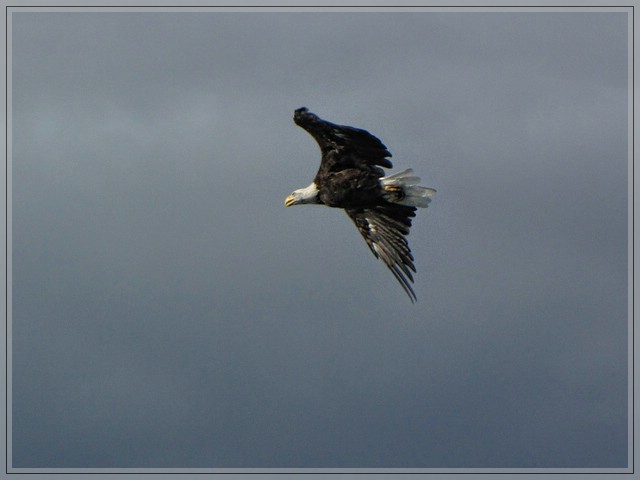 Ausserdem gibt es jede Menge Weisskopfseeadler zu sehen, was fuer die Leute aus Alaska etwa so spannend ist wie fuer Kieler eine Moewe. Waehrend wir also alle in Ruhe eine ganze Zeit den Baeren beobachtet haben, bin ich der einzige der auch fuer Adler bremst.
