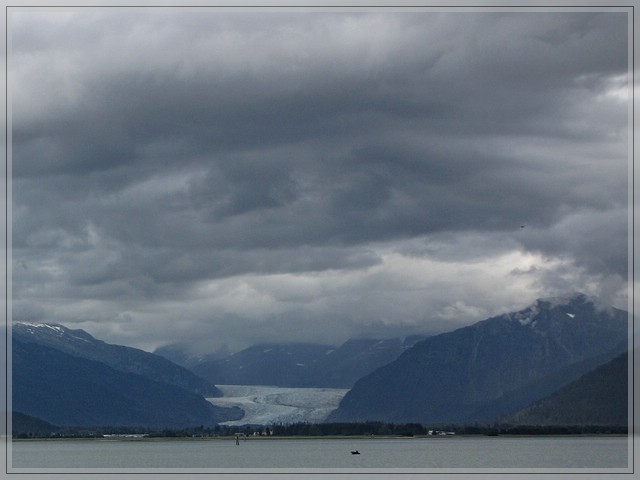 Der Mendenhall Gletscher scheint aus den Wolken zu kommen, so tief haengen sie.