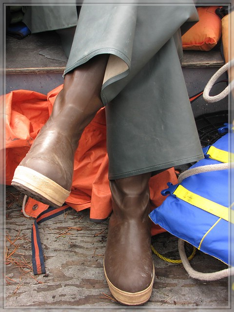 Als ich bei Rob auflaufe und er meine Leder-Wanderschuhe sieht, guckt er mich ganz mitleidig an und fischt ein paar alte Gummistiefel aus dem Schrank. Fuer eine Bootstour sicher die bessere Wahl und sie passen mir auch einigermassen. Sowieso laeuft die ganze Stadt in den gleichen braunen Gummistiefeln der Marke Xtra Tuf herum, weshalb sie auch den Spitznamen Juneau Sneakers bekommen haben.