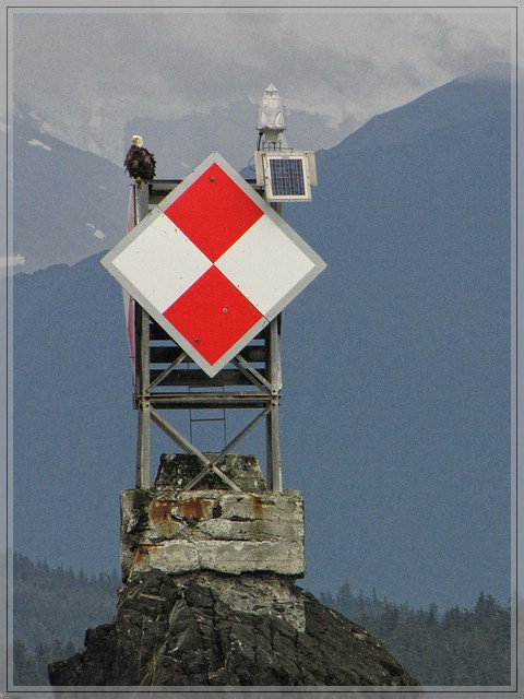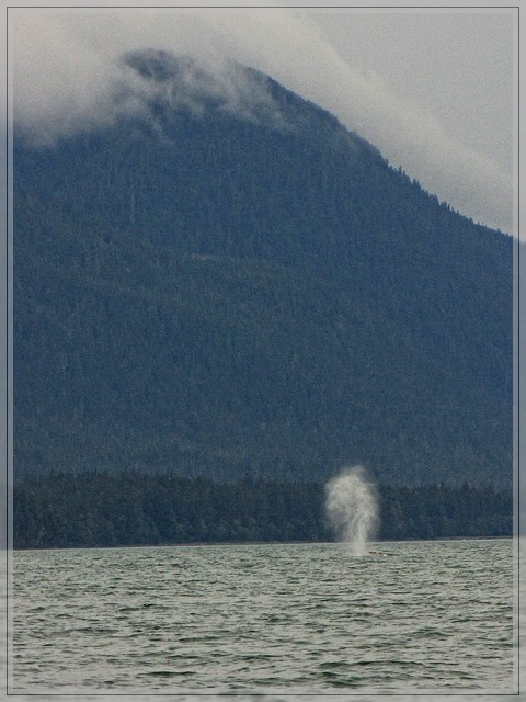 Wir passieren ein Seezeichen auf dem ein reichlich zerzauster Weisskopfseeadler hockt als Rob ploetzlich das Boot in eine Kurve legt, Gas gibt und uns auftraegt die Angelleinen einzuholen. Er hat einen Buckelwal blasen sehen und will versuchen etwas naeher heranzukommen. Ich sehe die Fontaene auch noch einmal bevor der Wal abtaucht. Leider hat der Wal andere Plaene und legt unter Wasser eine ganze Strecke zurueck bevor er wieder weit von unserem Boot entfernt hochkommt. Schade, es bleibt also bei dem Blick aus der Entfernung.