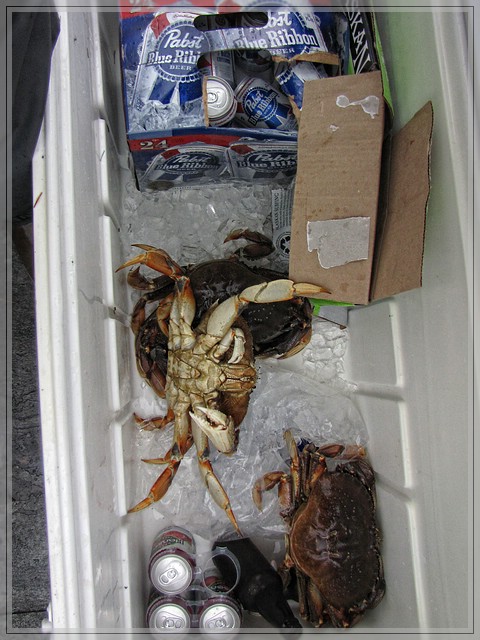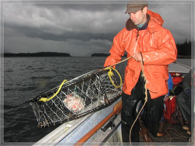 Auf dem Weg zurueck gucken wir noch nach Rob’s Crabpots. Immerhin da haben wir etwas Glueck und holen drei fette Dungeness Crab aus dem Wasser. Wider besseres Wissen hatten ich auf King Crabs gehofft, deren Beine ich bisher nur vorher tiefgefroren gegessen habe und zumindest bei Dungies ist frisch und gefroren ein echter Unterschied. King Crabs werden weiter im Norden in der Bering See gefangen, aber eine haette sich ja aus Versehen mal nach Suedostalaska verirren koennen.