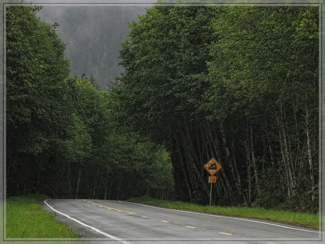 Wir fahren die Strasse. Die Strasse (the Road) ohne weitere Angaben ist in Juneau eine absolut uebliche und eindeutige Wegbeschreibung, denn es gibt nur eine Strasse, die aus Juneau hinausfuehrt und das ist der Glacier Highway der von Juneau aus nach Norden fuehrt und dort irgendwann aufhoert. Alle Wege fuehren nach Rom und keiner nach Juneau. Aufgrund seiner abgelegenen Lage ist Juneau nicht an das restliche Strassennetz in Kanada und Alaska angeschlossen und kann nur per Boot oder Flugzeug erreicht werden.