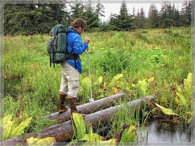 Dann erreichen wir die von vielen kleinen Wasserlaeufen durchzoegene Sumpflandschaft. Der Trail fuehrt eigentlich aussen herum, aber Julie behauptet, dass es auch einen Weg mittendurch gibt. Seit sie mal mitten im Industriegebiet wandern wollte, weil sie sich zwischen der Insel auf der die Industrieanlagen waren und einer anderen landschaftlich deutlich schoeneren Insel mit aehnlich klingenden Namen vertan hatte und dann verzweifelt rumtelefonierte, ob jemand wuesste wo zwischen den Hallen und Kraenen denn der Trail zu finden waere, ist die Gute nicht unbedingt als Pfadfinderin bekannt.