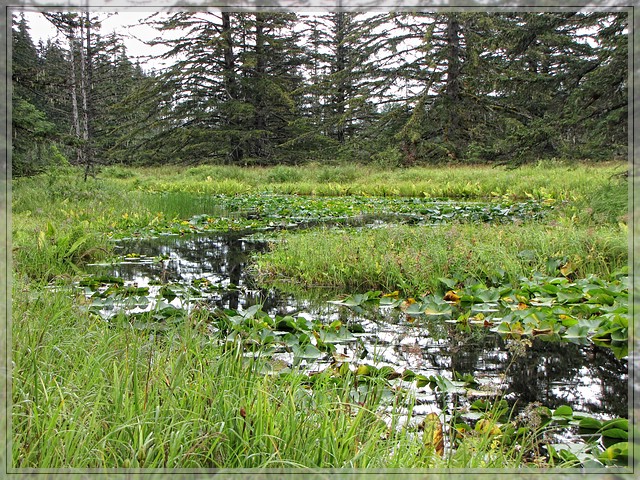 Die Cabin liegt in der fuer Suedost Alaska typischen Muskeg-Sumpflandschaft im Bridget Point State Park und ist ueber einen zweieinhalb Meilen langen Trail erreichbar.
