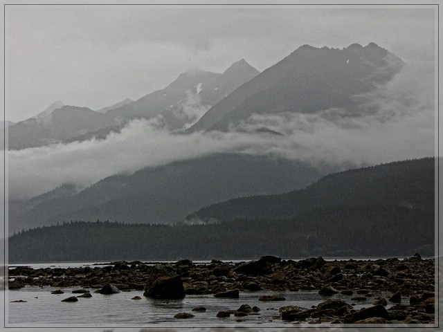 Der Strand liegt an einer Bucht von der aus man einen tollen Blick auf die Berge der Umgebung hat, die sich alle einen vornehmen Schleier aus Wolken gegoennt haben. Als ich an diesem einsamen Strand stehe habe ich das Gefuehl: ja, das ist so wie ich mir Alaska vorgestellt habe und ich mag gar nicht wieder weg.