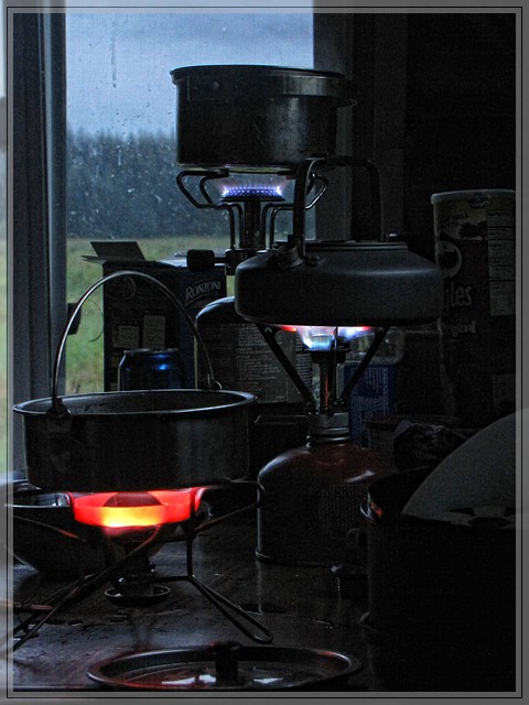 Irgendwann geht es dann aber doch zurueck zur Huette, wo inzwischen - wie beim chaotischen Packen schon befuercht - ein Problem aufgetaucht ist. Neben einem neuen Kocher gab es auch einen Topf als Hochzeitsgeschenk und beides sollte auf der Tour eingeweiht werden. Der Kocher funktioniert wunderbar und der Topf war bei naeherem Hinsehen eine Plastikschuessel. Zum Nudelkochen ueber offener Flamme nicht unbedingt die erste Wahl. Da wir nicht knapp an Kochern waren wurde in Ermangelung von Toepfen am Ende sogar im kleinen Teepott noch Pasta gekocht. Und zum Servieren hatten wir ja eine schoene Plastikschuessel ;-)