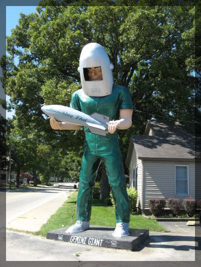 Im weiteren Verlauf der Strecke wird die Gegend deutlich ländlicher. Die alte Route 66 zeigt ein Bild, das uns im weiteren Verlauf der Reise wohl noch über lange Zeit begleiten wird: Landstraße, Telegraphenmasten und Eisenbahnstrecke laufen einträchtig nebeneinander her. Kurz darauf sehen wir die erste typische Route 66-Sehenswürdigkeit: In Wilmington, knapp 25 km hinter Joliet steht der Gemini Giant, ein besonders gut erhaltener Muffler Man. Diese überlebensgroßen Figuren waren als Werbung gedacht und hielten ursprünglich einen Auspufftopf in der Hand. Später wurde der Auspuff entfernt und teilweise durch andere Gegenstände ersetzt. Der Gemini Giant ist zum Astronauten umdekoriert wurden und hält eine Rakete in der Hand.