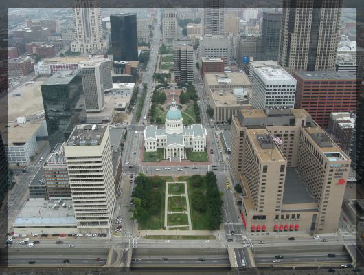 In St. Louis wollen wir uns zuerst den Gateway Arch anschauen, den großen Stahlbogen, der die Expansion der USA nach Westen symbolisiert. Wir haben von Deutschland aus Karten für die 9:30-Tram gekauft und haben im Moment noch keine rechte Idee, was wir uns in diesen Kontext unter dem Begriff "Tram" vorstellen sollen. Über die I 270, I 255 und I 70 fahren wir nach Downtown St. Louis. Wir sind relativ spät dran, daher ist es dem guten Verhältnis zu unserem Navisystem nicht gerade förderlich, als das Ding uns auf der Interstate einmal falsch leitet und dann in Downtown zum (recht hübschen) Old Court House anstatt zum gewünschten Parkplatz führt. Allen Widrigkeiten zum Trotz sind wir um 9:15 am Gateway Arch, der in einer schönen Grünanlage steht. Der 192 Meter hohe Bogen ist schon aus einiger Entfernung von der Autobahn aus zu sehen. Aus der Nähe erkennt man erst, wie riesig das Ding ist. Direkt unterhalb eines der beiden Pfeiler ist der Eingang zum Museum of Westward Expansion und zu den Bahnen zur Aussichtsplattform. Da wenig los ist (die riesige Halle ist absolut leer), dürfen wir eine Bahn früher als gebucht nehmen. Die Bahn besteht aus einzelnen faßförmigen Kabinen, die an der Achse drehbar aufgehängt sind. So wird beim Anstieg der sich stetig ändernde Winkel des Bogens ausgeglichen. Das Gefühl, eingepfercht in so einer Viermannkabine hochgezogen zu werden, ist nichts für Leute, die zu Klaustrophobie neigen. Der Blick von der Aussichtsplattform des Bogens ist gigantisch: Wenn man nach unten schaut, sieht man fast 200 Meter Leere und links und rechts die Pfeiler, das ist definitiv nichts für schwache Nerven. Im Osten sieht man den breiten, braunen Mississippi, im Westen die Metropole St. Louis mit dem Old Court House, dem Busch Stadium und dem Edward Jones Dome.