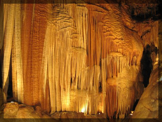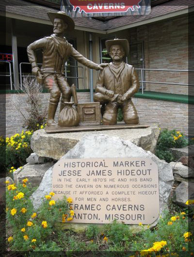 Gegen Mittag verlassen wir St. Louis. Während bis jetzt der Himmel nur bedeckt war, beginnt es nun, mehr oder weniger heftig zu regnen. Nach ungefähr 100 Kilometern kommen wir nach Stanton, die Heimat der Meramac Caverns. Diese Höhlen sind unter anderem für ihre leicht penetrante Werbung berühmt: Im Umkreis von bestimmt 150 Kilometern wird man als Autofahrer durch überdimensionierte Werbetafeln zum Besuch der Höhlen animiert, in denen sich angeblich Jesse James vor der Polizei versteckt hat und durch einen Hinterausgang auch entkommen konnte. Wir wollen uns das natürlich anschauen. Im Inneren erschrecken wir zunächst, wir sind nämlich in einen der USA-typischen Andenkenläden mit angeschlossenem Fast-Food-Lokal gelandet. Ein paar hundert Meter weiter befindet sich der eigentliche Höhleneingang. Wir nehmen an einer Tour teil und sind angenehm überrascht. Hinter einer riesigen natürlichen Halle, die als Ballsaal benutzt wurde und noch wird (früher sind die Leute sogar mit dem Auto hier rein gefahren) und einer Halle mit dem größten nicht funktionierenden Foucaultschen Pendel der Welt, beginnt ein verwinkeltes Labyrinth mit vielen schönen Tropfsteinen. Kurz vor dem Ende der Führung kommen wir zu einer riesigen "natürlichen Leinwand", gebildet aus zusammengewachsenen Tropfsteinen. Die Amerikaner, pragmatisch wie sie sind, haben auch einen dazu passenden Vorführraum in den Berg gebaut. Als Demonstration wird die US-Flagge an die Wand projiziert, mit dröhnender "God bless America"-Untermalung. Kitsch as Kitsch can…