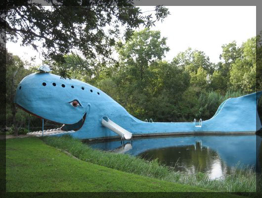 Weiter geht es nach Südwesten, die nächsten paar Kilometer direkt entlang der Interstate. Über die Zwillingsbrücke am Videgris River kommen wir nach Catoosa. Diese Stadt ist für ihren blauen Walfisch bekannt. Dieser Wal bildet das Zentrum eines alten Freibads aus den 70er-Jahren und bietet Zugang zur Wasserrutsche und zum Sprungbrett. Witzigerweise beinhaltet die gesamte Dekoration des Schwimmbads kleine Variationen des großen Walfischs, so zum Beispiel die Bänke und sogar das Klohäuschen.