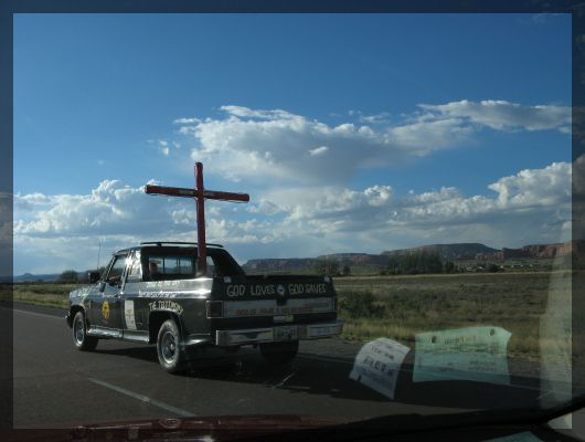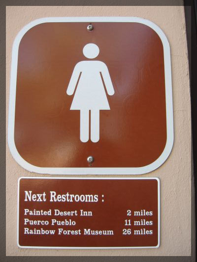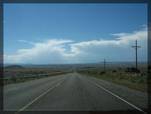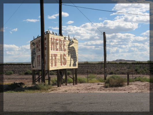 Route 66 in New MexicoKurz vor der Grenze nach Arizona kommen wir an einem weiteren Indian Village vorbei. Besonderheit an diesem Ramschladen ist die sehr pittoreske Lage im Eingang einer großen Höhle. An der Grenze nach Arizona besuchen wir das Begrüßungscenter und kommen so zum ersten Mal während unserer Reise dazu, ein paar der vieldiskutierten Couponhefte abzugreifen. Wir sind gespannt, ob wir damit wirklich die Motelkosten drücken können. Die Tankstelle direkt neben dem Begrüßungscenter ist übrigens die allererste auf unserer Reise, die vor Beginn des Tankvorgangs unsere ZIP verlangt. Wir verwenden unsere heimische Postleitzahl - die existiert auch in den USA und gehört zu einem Kuhkaff 150 km östlich von Denver - und können so problemlos den Wagen voll tanken.