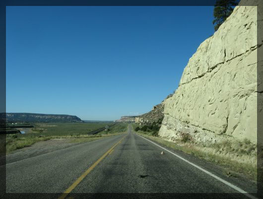 Westlich von Gallup verläuft die Route 66 durch ein breites Tal mit steilen, fast klippenartigen Anstiegen links und rechts. Während die Interstate quer durch die Mitte führt, schmiegt sich die ältere Straße an den Rand.