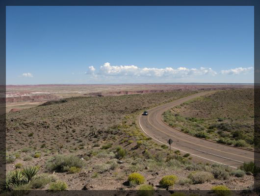 Die gut 70 km von der Staatsgrenze zum Petrified Forest National Park legen wir zum Großteil auf der Interstate zurück. Am Eingang des Nationalparks verlangt Dirk einen Jahrespass und ist nach unseren Sandia-Erfahrungen gespannt, was passiert. Wie eigentlich zu erwarten, bekommen wir ohne Widerspruch einen America the Beautiful-Pass ausgehändigt und brechen auf, den Park zu erkunden. Gleich am ersten Aussichtspunkt machen wir eine ausgedehnte Pause. Wer sich unter einer "Painted Desert" nichts vorstellen kann, bekommt hier auf schönste Weise verdeutlicht, woher dieser Name kommt: Unter uns breiten sich ausgedehnte Hügel in Rot, Orange, Braun und Weiß aus. Das Bild macht wirklich fast den Eindruck, als wären die verschiedenen Farben nacheinander von Bob Ross auf seine Leinwand aufgebracht worden. Wir fahren weiter in das Innere des Parks und bekommen so die großartige Landschaft aus immer neuen Blickwinkeln zu sehen. Kurz bevor wir die Interstate kreuzen, kommen wir an einem Denkmal für die Route 66 vorbei.