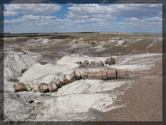 Route 66-Denkmal im Petrified Forest National ParkIn der zweiten Hälfte des Parks ändert sich allmählich die Stimmung: Die Badlands sind nicht mehr von roten Farben geprägt, stattdessen gibt es nun beeindruckende graue Strukturen aus Bentonit, die ein wenig an Schlammhaufen erinnern. Etwas später kommen wir in den Bereich, der den Park seinen Namen gegeben hat: Zuerst sehen wir nur einzelne versteinerte Bäume, dann werden es immer mehr. Hier laufen wir den Trail am Crystal Forest ab. Zunächst läuft eine Gruppe Japaner vor uns her. Nach kurzer Zeit realisieren die Japaner allerdings die Länge des eigentlich recht kurzen Trails und kehren um. Wir dagegen nehmen uns viel Zeit, um die Eindrücke in uns aufzunehmen: Auch wenn noch zu Beginn des 20ten Jahrhunderts viele der versteinerten Baumstämme zerstört wurden, um an im Inneren enthaltene Mineralien zu gelangen, ist die Menge der noch vorhandenen Bäume überwältigend. Wir berühren die versteinerte Baumrinde und sind überrascht: Da die Struktur erhalten geblieben ist, fühlen sich die Bäume trotz des völlig anderen Materials genau so an, wie lebende Bäume aus Holz.