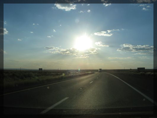 Sonnenuntergang über der I 40Während wir uns weiter Flagstaff nähern, wird die Landschaft immer mitteleuropäischer: Nachdem wir den Großteil des Tages durch eine Steppe gefahren sind, säumt nun dichter Kiefernwald die Straße. In Flagstaff weigert sich das Rodeway Inn, unsere Coupons anzuerkennen, das ist uns egal, dann gehen wir halt zur anderen Straßenseite ins Motel 6.