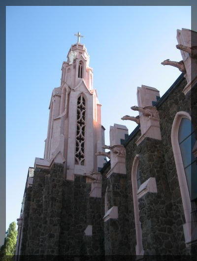 Katholische Kirche in FlagstaffDie Eisenbahnlinie der Burlington Northern Santa Fe Railway führt direkt an der Altstadt vorbei, alle fünf bis zehn Minuten donnert ein kilometerlanger Güterzug vorbei. Wir zählen bei einen der Züge nach und kommen auf vier Lokomotiven sowie 107 Waggons.