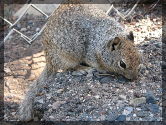 Blick in den Grand CanyonWieder zurück im Grand Canyon Village, erleben wir, was die vielen Schilder wert sind, in denen verboten wird, sich wilden Tieren zu nähern oder diese zu füttern: Neben dem Weg schaut ein Squirrel schüchtern in unsere Richtung. Dirk will das Tier mit seiner Digicam aus einiger Entfernung filmen und geht dafür in die Knie. Das Squirrel bringt diese Geste scheinbar mit Futter in Verbindung und nähert sich langsam aber sicher. Alle paar Schritte wird ausgiebig geschnüffelt und dann weitergehoppelt. Schließlich greift das Tier direkt in die Linse der Kamera und hüpft dann erschrocken davon.